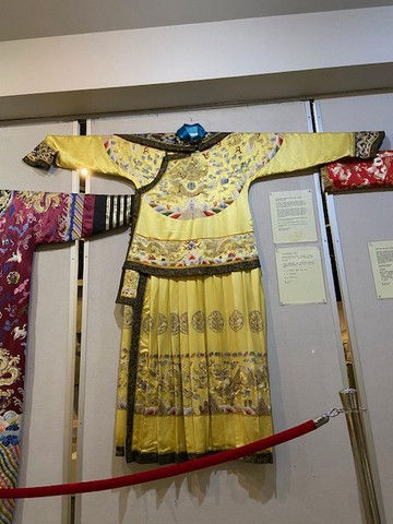 BRIGHT YELLOW - The most prestigious color. This bright yellow court robe is the most formal garment, and it is worn by the Emperor while attending grand ceremonies such as those on New Year's Day, the Winter Solstice, birthdays, and the days when sacrifices were offered to ancestors at the Imperial Ancestral Temple. The robe is made from bright yellow satin embroidered with gold dragon designs.